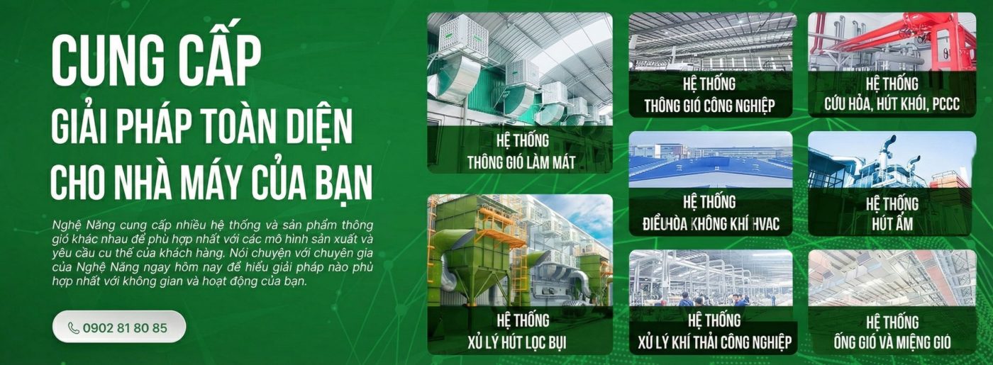 Công ty TNHH Công Nghiệp Nghệ Năng là doanh nghiệp hàng đầu trong lĩnh vực quạt công nghiệp và hệ thống làm mát tại Việt Nam. Không chỉ trực tiếp sản xuất và thi công các giải pháp thông gió, làm mát, Hút khói PCCC cho các doanh nghiệp mà Nghệ Năng còn sở hữu những thương hiệu nổi tiếng trên thị trường như